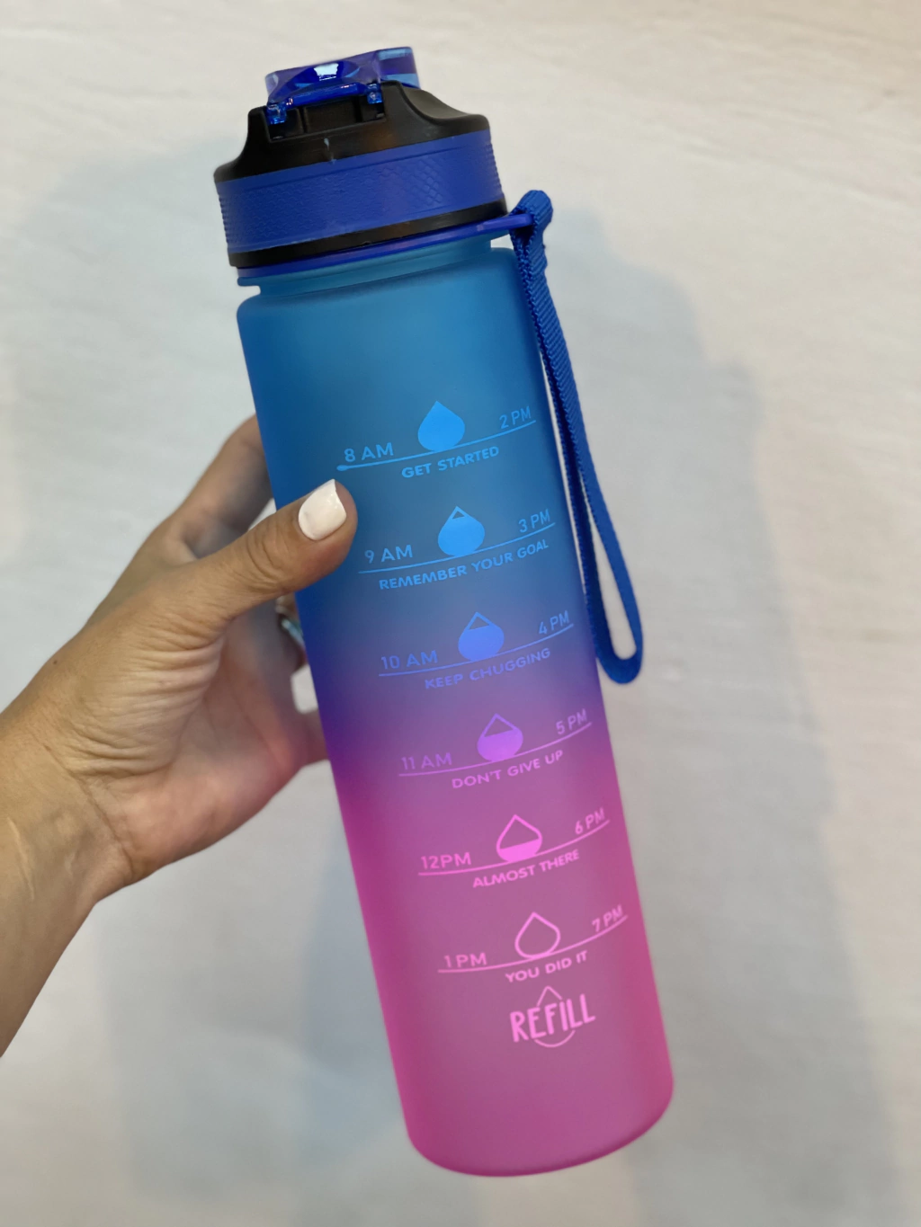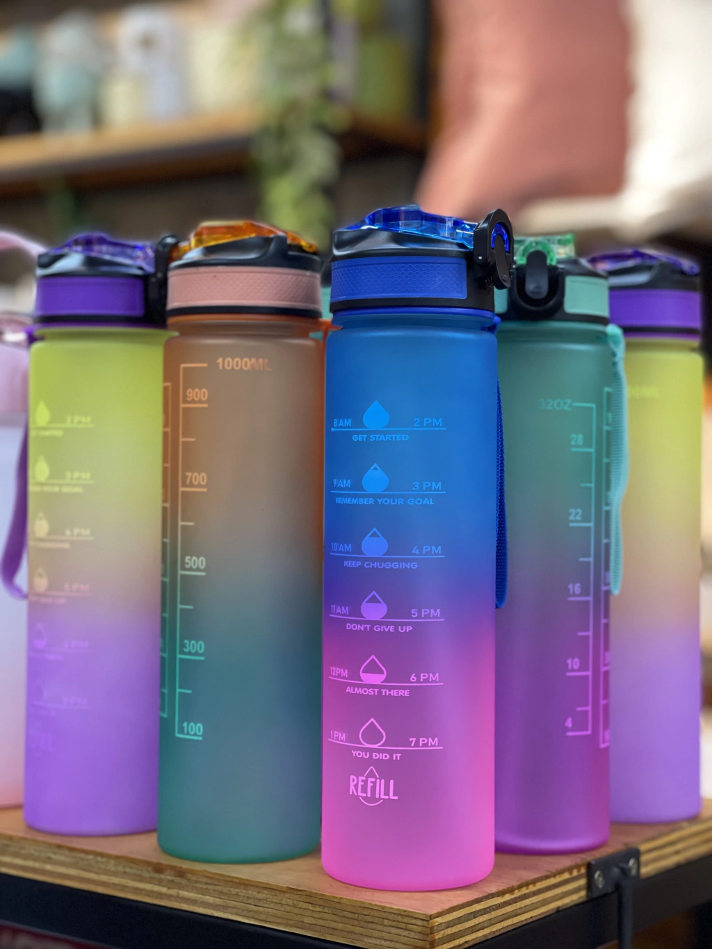 Las botellas más lindas y de excelente calidad ! En colores bien power con impresión de ambos lados : un lado horarios | otro lado capacidad. Cierre súper hermético con pico y traba, ideal para trasladarla y que nada se vuelque. Capacidad: 1000ml