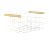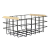 Canasta de hierro y agarre de madera con encastre y ranuras que permite apilarlas.