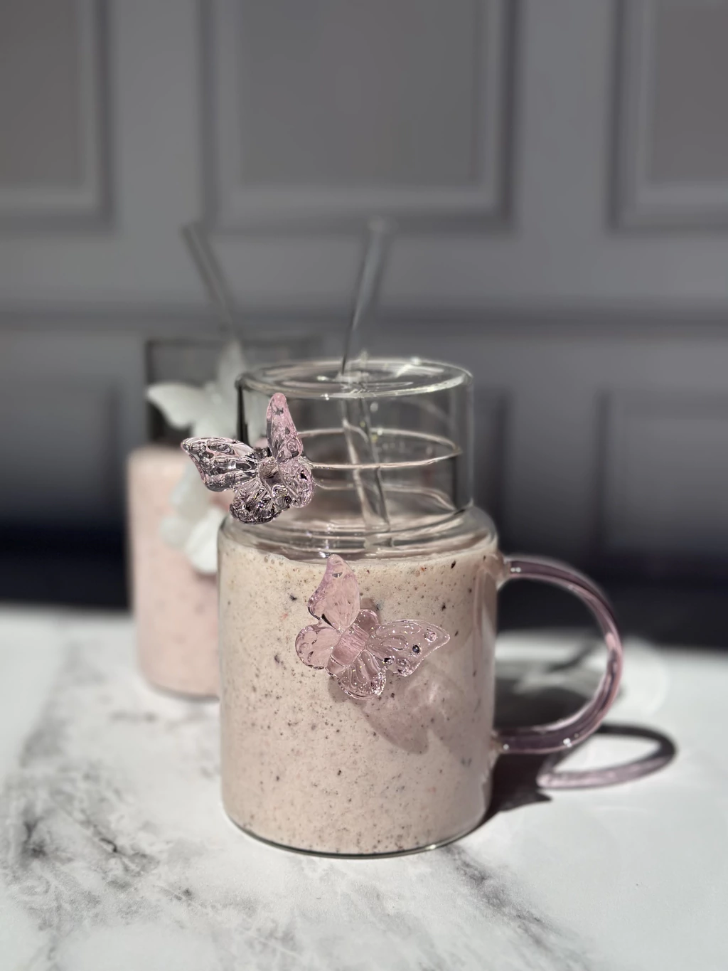 Con una hermosa mariposa de color en vidrio, este vaso no solo es funcional, sino también un elemento decorativo perfecto para cualquier ambiente. Incluye una tapa y un sorbete, brindando comodidad en cada uso.